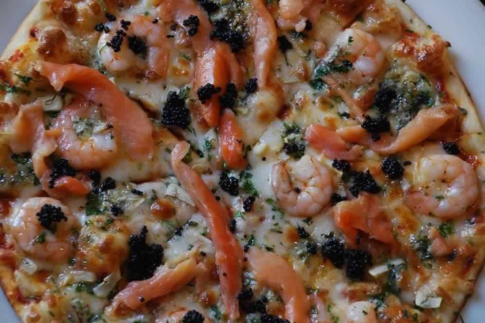 - هنحط الجمبري على العجينة و بعدين نرش الصلصة عليها.