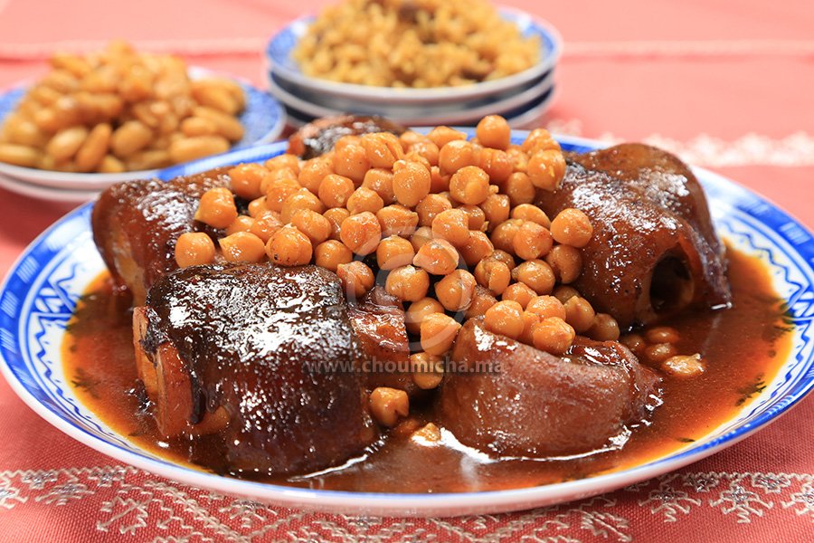 - عندما تنضج أرجل العجل ومقادير التزيين ويصبح المرق كثيفا، توضع قطع الأرجل في طبق، تسقى بالمرق المصفى وتزين بالحمص. يقدم الطبق مرفوقا بالفاصوليا والأرز بالعنب المجفف (الزبيب).