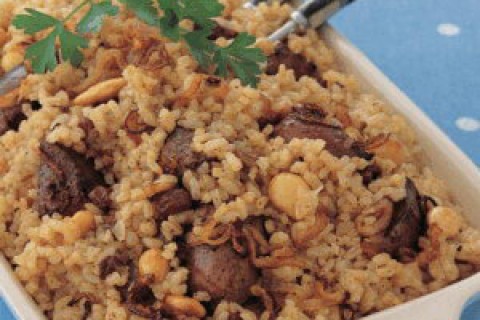 - يُضاف الزبيب المجفّف، واللوز المقشّر والمقلي، ومسحوق القرفة، ومكعّبات مرقة الدجاج ماجي ، والأرز. تُحرّك المكوّنات لمدّة دقيقةٍ واحدةٍ ثم يُضاف الماء. يُغلى المزيج مع التحريك من وقتٍ لآخر ثم تُخفّف النار وتُغطّى المكوّنات وتُترك على نارٍ خفيفةٍ لمدّة تتراو