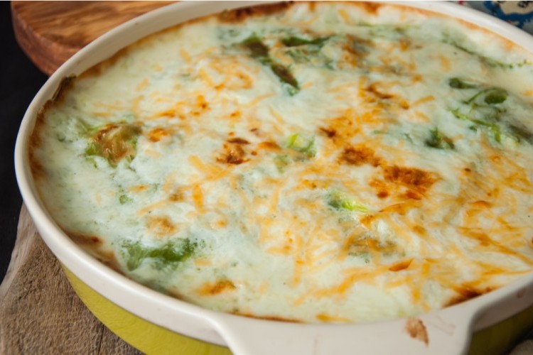 - نسكب البشاميل على وجه الصينية، ثم نضع الصينيّة في فرن مسخن مسبقاً على حرارة 200 درجة مئويّة وتترك في الفرن حتى تصبح ذهبية اللون.