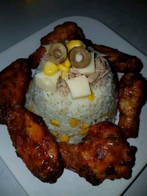 أرز بالذرة والتونة مع أفخاذ الدجاج