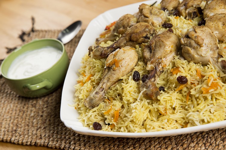 5. أضيفي الأرز ودعيه يغلي بقوة بضع دقائق ليتشرب الماء قليلا ثم أعيدي قطع الدجاج على سطح الأرز وانثري فوقه الزبيب.