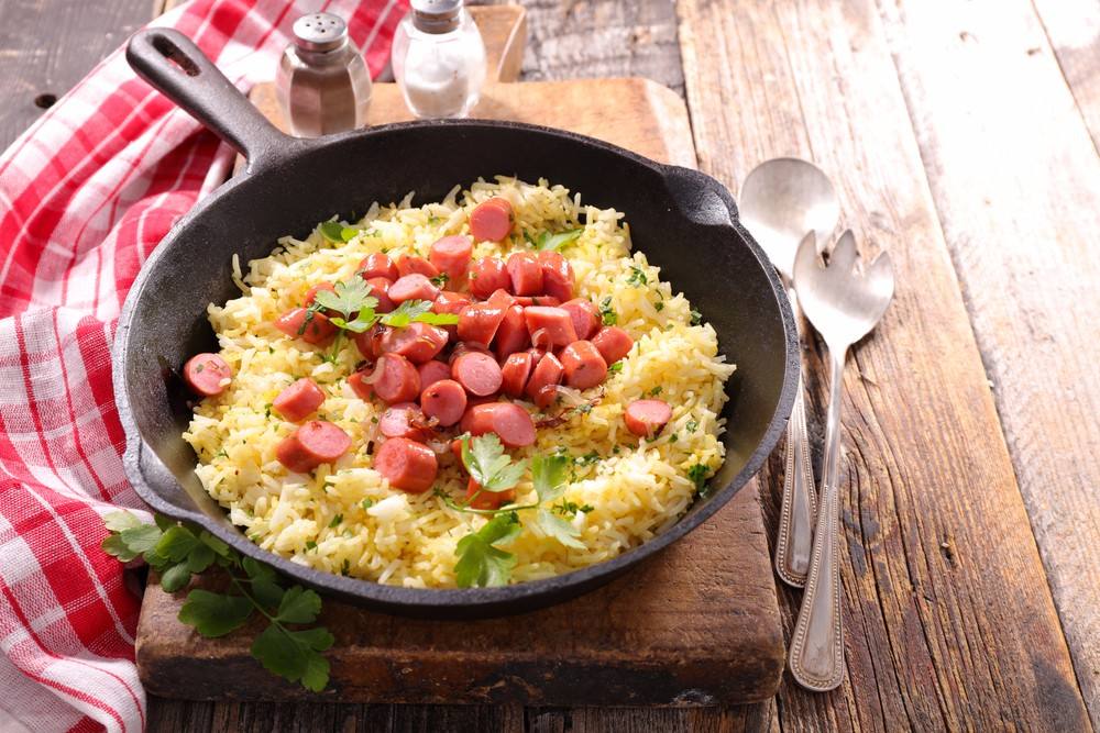 - يوضع الأرز في الطبق، ويوضع فوقه السوسيس.