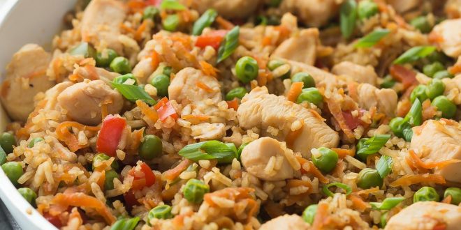 - نضع الزيت في مقلاة كبيرة وعميقة على حرارة عالية، ثم نضع الفاصولياء الخضراء والبصل ونحرك لمدة 5 دقائق حتى تصبح طرية، ثم نضيف الفليفلة الحمراء المقطعة وفلفل أسود و1/2 ملعقة صغيرة ملح ونحرك لمدة 3 دقائق حتى تصبح الفاصولياء والفليفلة هشة وتفوح منها رائحة التوابل الشهية . نضيف بعد ذلك مرق الدجاج ونحرك الدجاج المقطع والرز والتوابل المشكلة و1/2 ملعقة صغيرة ملح ونترك المزيج يغلي لحوالي الدقيقة حتى لا يبقى أي سوائل زائدة .