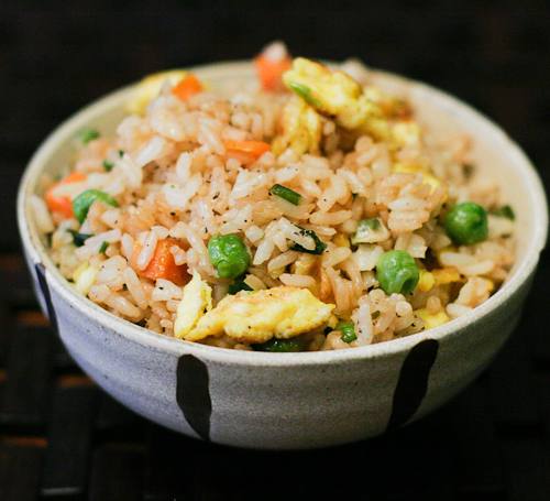 - يسخَّن قِدر على نار قوية ثم يضاف الزيت النباتي والجزر والبازيلاء وتُقلّى لمدة 30 ثانية ثم يسكب البيض المخفوق ويُحرّك المزيج جيداً.