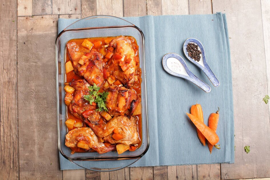 نتبل الارنب بالملح والفلفل الاسود ويشوح فى زيت ثم يرفع ننزل مكانه بالبصل ثم الثوم ثم جزر ثم البطاطس ثم بيورية طماطم والعسل ثم ملح وفلفل اسود واخر حاجة ننزل بمكعبات الطماطم والارنب