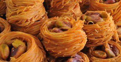 7. تُحشى وحدات الكنافة بخليط الفستق، ثم تُرص في طبق التقديم، ويُوزع فوقها قليل من القطر