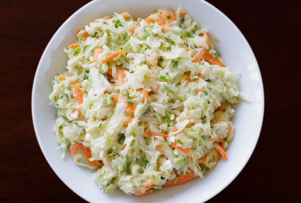 3. رشي الملح والفلفل الأسود على المايونيز وحركي جيداً بالمضرب اليدوي، وضيفي خليط المايونيز فوق الملفوف والجزر وحركي من جديد لتتجانس المقادير. ثم قدمي سلطة الكولسلو.