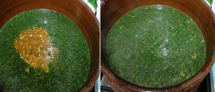 تخرط الملوخية بالكبة أو جهاز فرم البصل أو( بالمخرطة) علي صينية  حتي تصبح ناعمة .توضع في طبق ويلاحظ إنكماش كميتها .