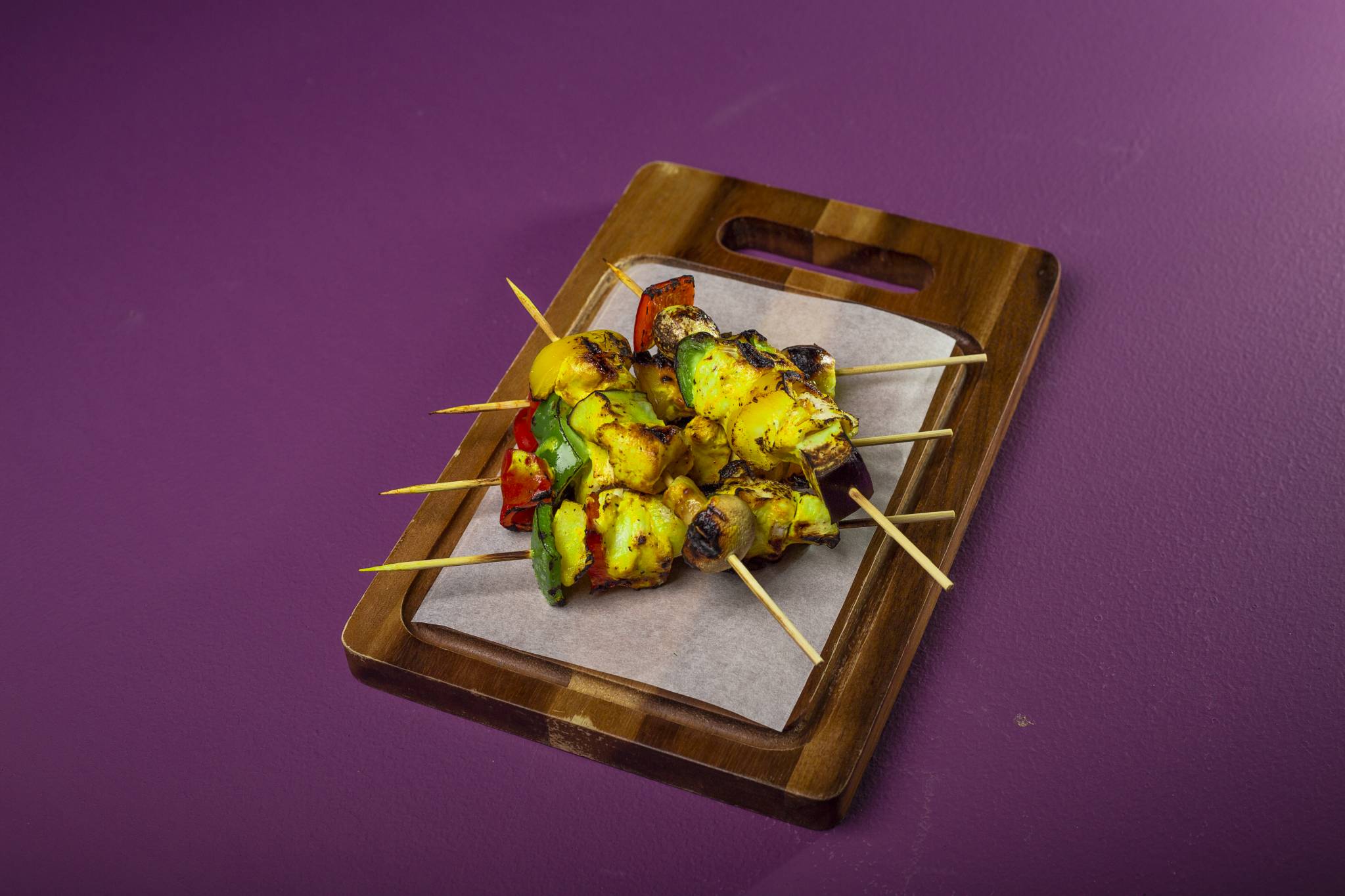 يصفى المنقوع من الدجاج والخضار ويرمى. يدخل الدجاج والخضار في الأسياخ بالتناوب.