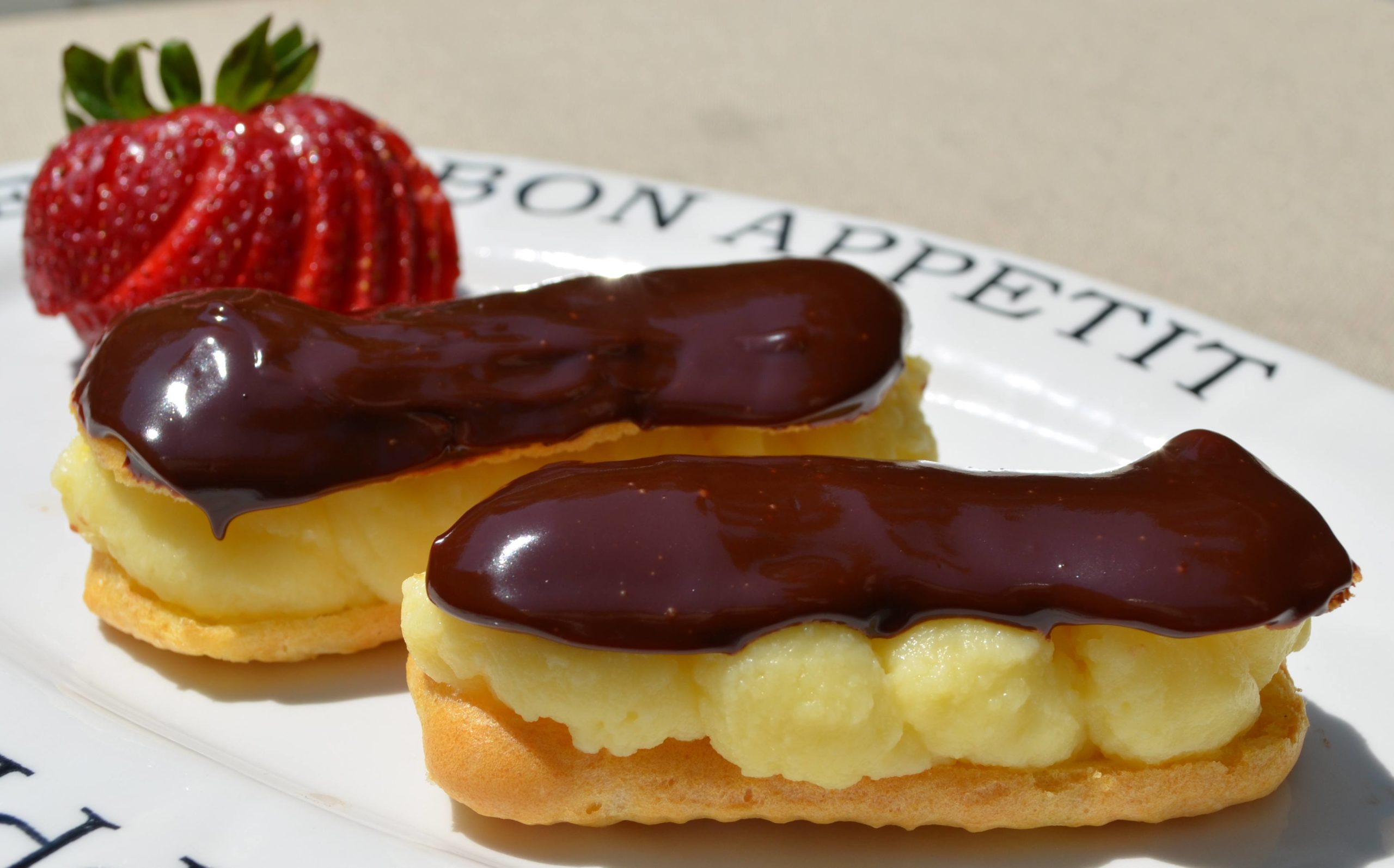 - يخفق البيض و الفانيليا والنشا في وعاء ثم يضاف الحليب ويخلط ليتكاثف ثم يوضع جانباً ليبرد تماماً ثم يحشو بها قطع الاكلير ثم يدهن سطحها بالشوكولا المذابة .