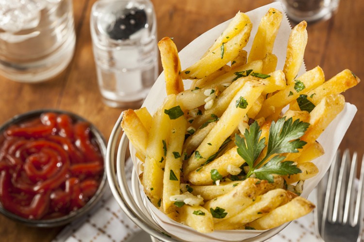 3. اطفئي النار تحت الثوم ثم أضيفي أصابع البطاطس المشوية وقلبي حتى تتمازج المكونات.