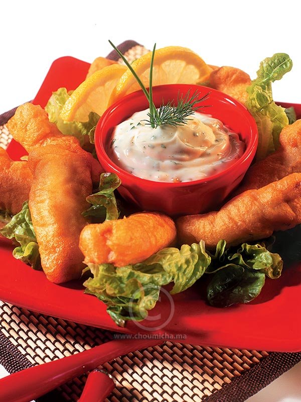 - تغمر شرائح الدجاج في العجين السائل وتقلى في حمام زيت ساخن حتى تنضج وتتحمر.