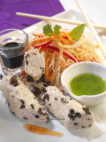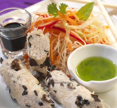 - ينقع الملفوف في الخل والسكر الخشن لمدة 15 دقيقة. يشطف الملفوف ويحتفظ به. في مقلاة على نار هادئة، يحمر البصل في الزيت مع الفلفل لمدة 4 دقائق. يضاف إليهما الكراث، الملفوف، الجزر ويستكمل الطهي لمدة 2 دقائق. تضاف الشعرية والقليل من صلصة الصويا. يخلط الكل ثم تزال المقلاة من فوق النار. يرش خليط الدجاج بأوراق القزبر.