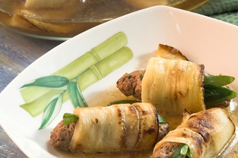 - قشري الباذنجان و قطعيه طوليا إلى شرائح رقيقة. ضعيه في طبق ورشي عليه قليلا من الملح ، اتركيه لبضع دقائق الى ان تتكون عليه قطرات من الماء، ثم جففي الماء المتكون على السطح بورق المطبخ.