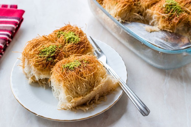 6. صبي القطر البارد على أصابع الكنافة، وزيني بالفستق الحلبي المبشور، وقدميها.