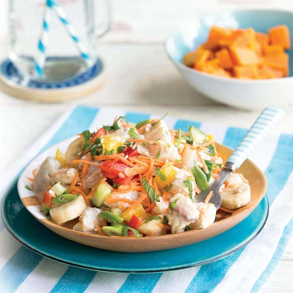 - اغسل وقطّع المانجو أو الخوخ والخيار والفلفل والبصل الأخضر إلى مكعبات. قشر وقطع الموز إلى شرائح. اغسل وابشر الجزر. أضف كل ذلك إلى السمك.