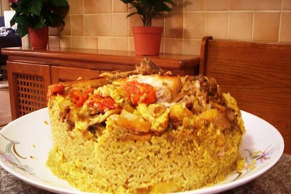 ٦. يترك القدر على نار هادئة لمدة 45 دقيقة، عند نضج الارز، تقلب القدر فى الصينية وتقدم ساخنة.