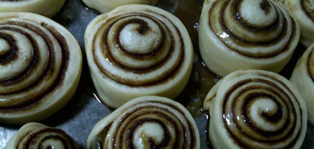 - لُفّي العجينة على شكل أسطوانة، ثمّ قطّعيها إلى قطعٍ متساوية، صفي لفائف السينابون في صينيّة مدهونة بالزيت، ثمّ غطّيها واتركيها حتى تختمر مجدداً من ساعة إلى ساعتين.