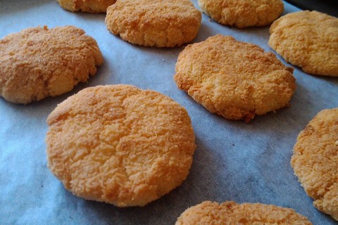 - نحضر صينية وندهنا ونقوم بتقسم العجين بملعقة ونضعه في الصينية ونخبزها في فرن درجة حرارته 160 مئوية حتى تنضج، وتقدم.