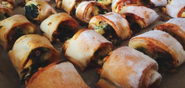 - فرد العجينة قليلاً لتصبح دائرة متوسطة الحجم ووضع ملعقة كبيرة من الحشو بالوسط وإقفالها بشكل مثلث ووضعها متباعدة عن بعضها في الصينية.