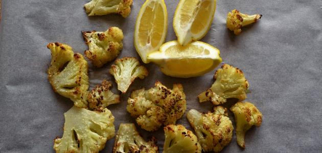 - نقل القرنبيط باستعمال ملعقة ذات ثقوب على قطعة من ورق المطبخ للتخلص من الزيت الزائد.