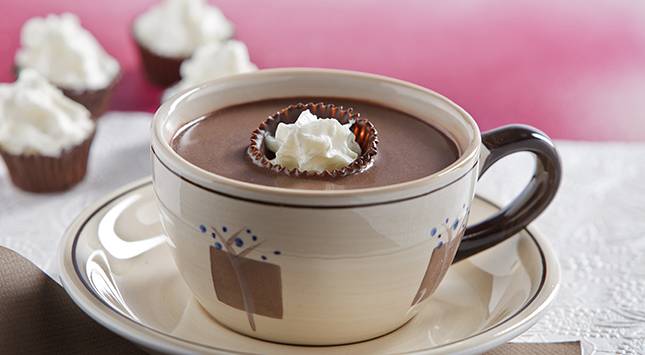 2. لعمل أكواب الشوكولاتة، تذاب رقائق الشوكولاتة والدهن في فرن الميكروويف ويُقلبا إلى أن يصبح الخليط أملس، ثم يُفرد الخليط بواسطة فرشاة المعجنات داخل أكواب ألومينيوم أو أكواب حلوى ورقية بحجم 1 بوصة، ثم توضع الأكواب في صينية خبز وتوضع في الثلاجة لمدة 45 دقيقة أو إلى أن يتماسك خليط الشوكولاتة. قبل التقديم مباشرة تزال الأكواب الألومينيوم أو الورقية وتضاف الكريمة المخفوقة.