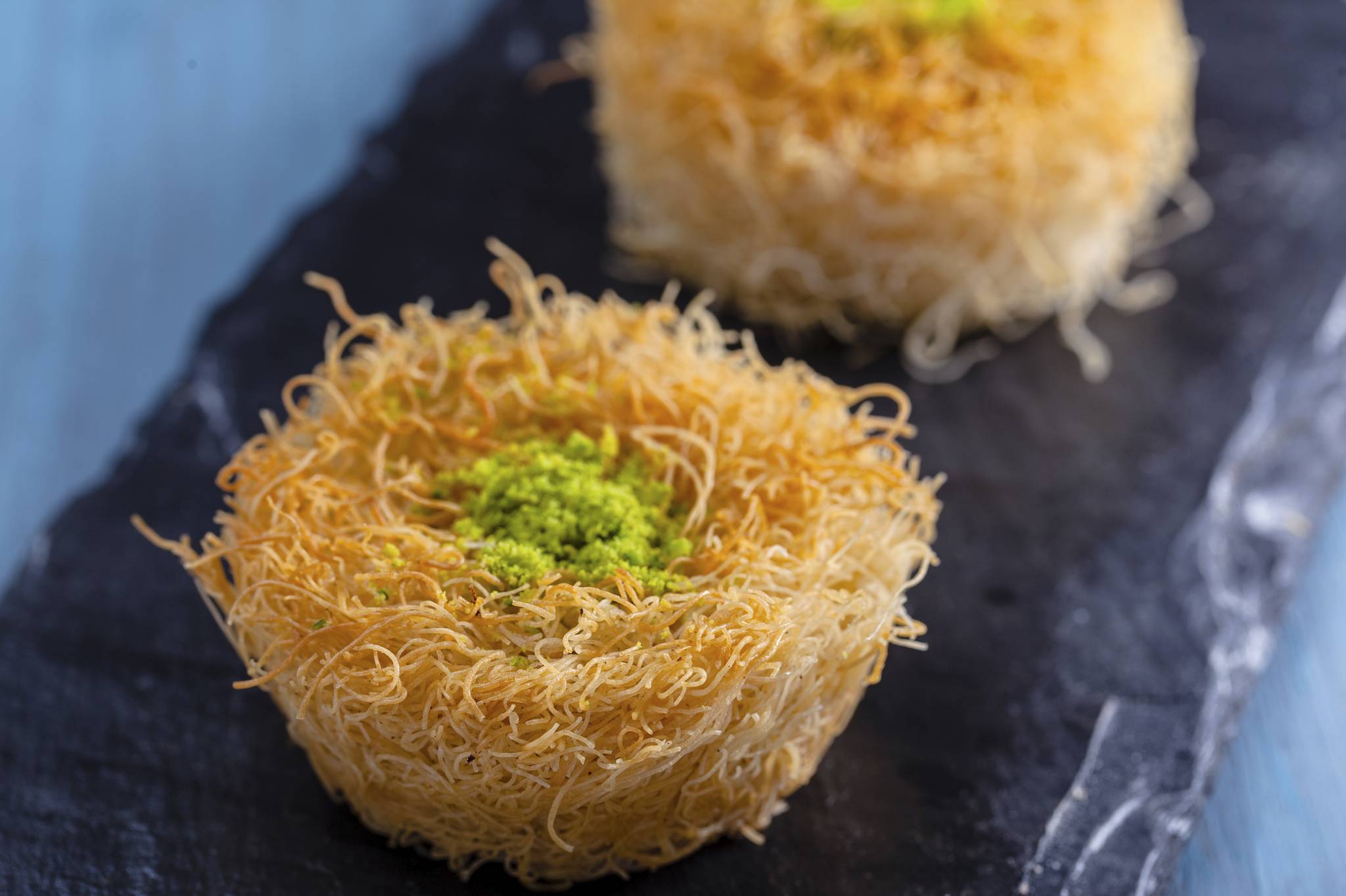 تغرف أكواب الكنافة من القالب وتوضع على طبق التقديم. تزين بالفستق الحلبي المطحون وترش بالقليل من القطر البسيط، ثم تقدم.