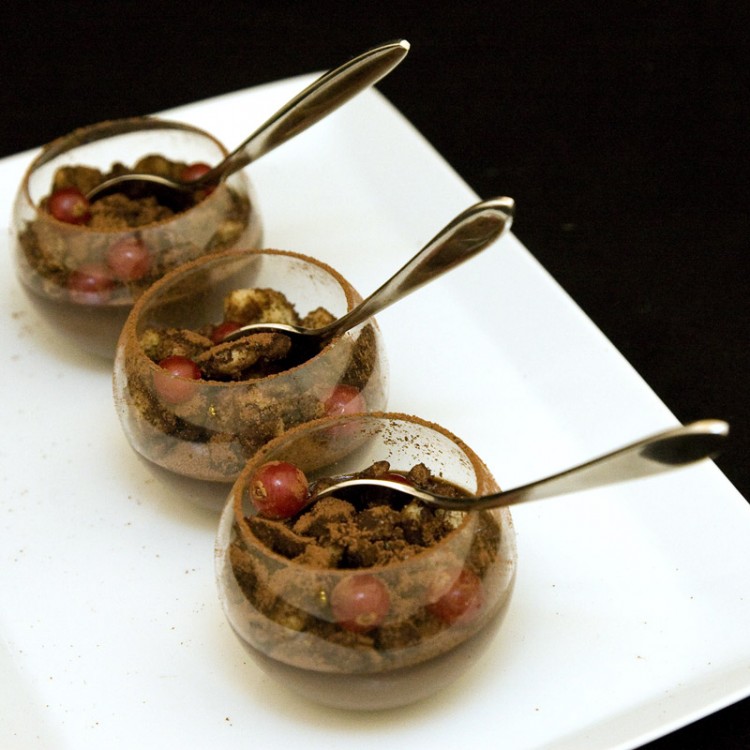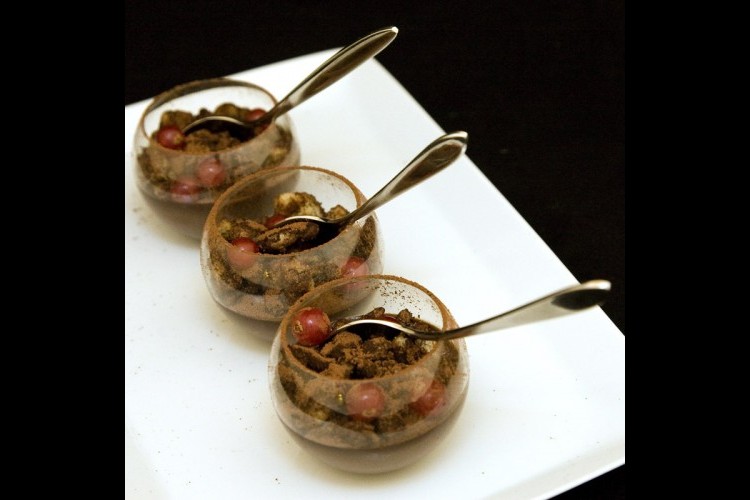 5- يسكب الخليط على الشوكولاتة المكسرة، مع التحريك، حتى يتكوّن مزيج ناعم ومتماسك.يسكب في أكواب تدع لتبرد، وتزيّن بالبسكويت وتنثر بودرة الكاكاو عليها، كما حبات التوت البرّي .