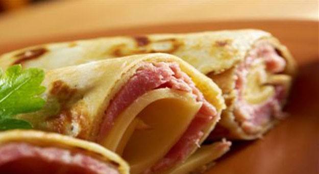 4/ تترك الفطائر لتبرد وتحشى بخليط السوسيس والجبن وتلف على شكل أسطوانى.