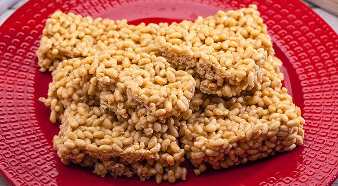 يضاف 2 كوب من أرز كريسبي ونخلط حتى يتغلف كل شيء بالتساوي. ثم يصب في صينية.
