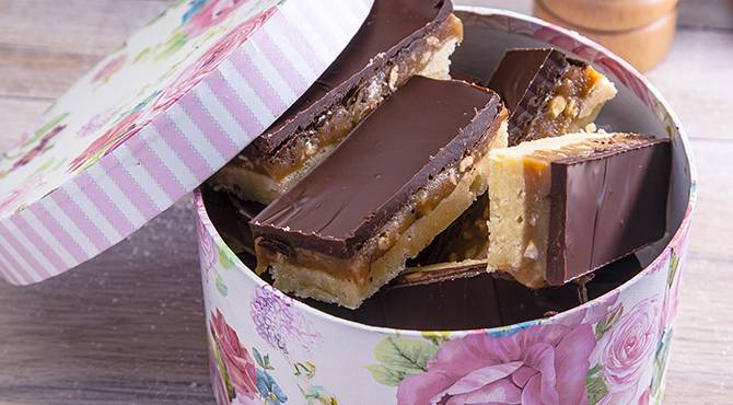 عندما يتماسك الكراميل، تخلط الشوكولاتة والزيت في وعاء آمن للاستخدام في الميكروويف، حتى تذوب الشوكولاتة، ثم تصب فوق طبقة الكراميل وتوضع في البراد حتى تبرد.