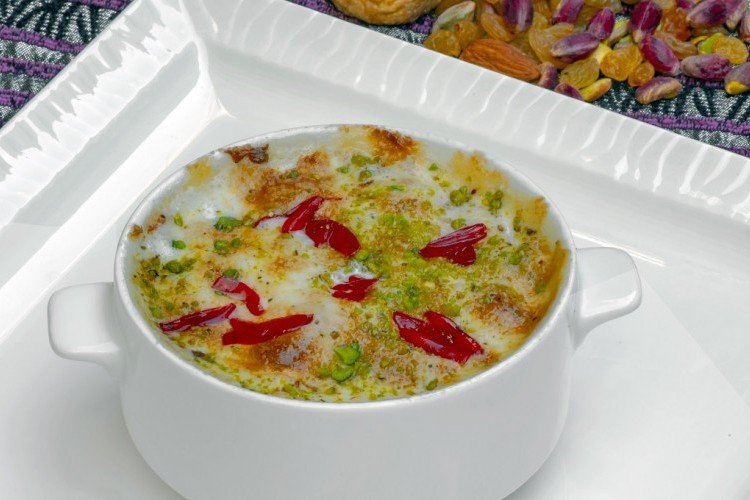 أمّ علي .. قدمي على طريقة الشيف أطيب الحلويات العربية السهلة والملائمة كضيافة لذيذة في شهر رمضان الكريم، قدمي أم علي مزين بالفستق وأوراق من زهر الليمون