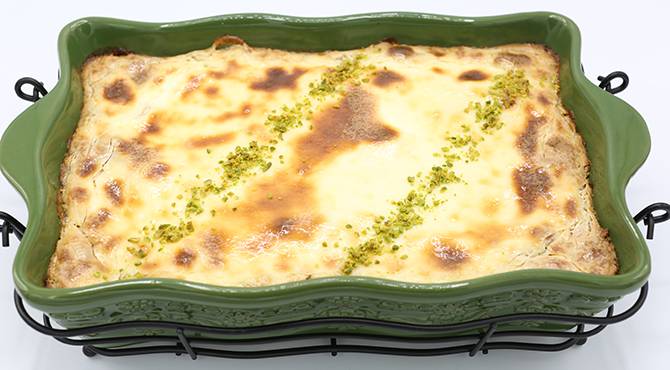 التزيين: ضعي الفستق على سطح القشطة حسب الرغبة.