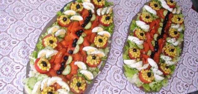 - نزين أطراف صحن التقديم بأوراق الخس، ثم نضع بكل ورقة نوع من الخضار المتبلة بطريقة أنيقة.