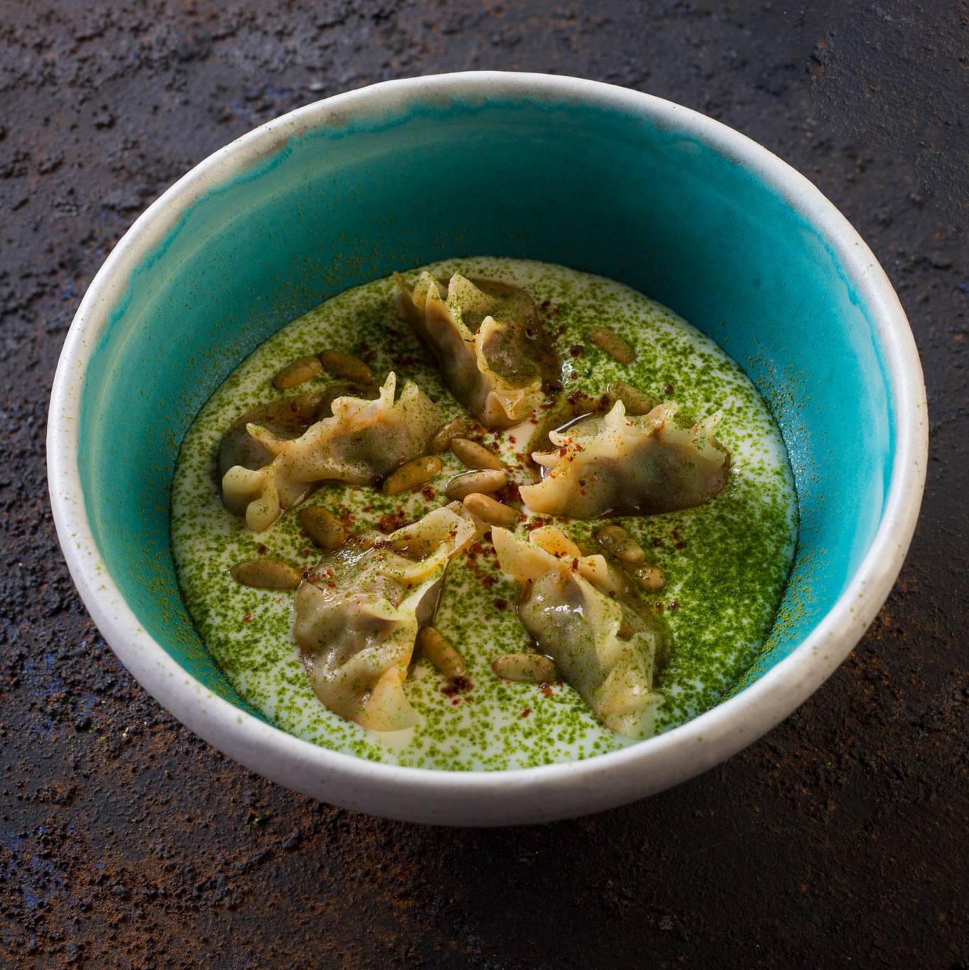قم برش الفلفل الحلبي والنعناع المجفف متبوعًا ببعض رذاذ زيت الزيتون و التزيّين بمكسرات الصنوبر ويقدم على الفور
