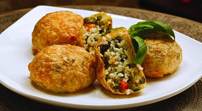 عندما يبرد الأرز تمامًا توضع كمية من الأرز في عجين البف بستري وتغلق جوانبه لتكوين كرة مسطحة قليلاً من الأسفل.