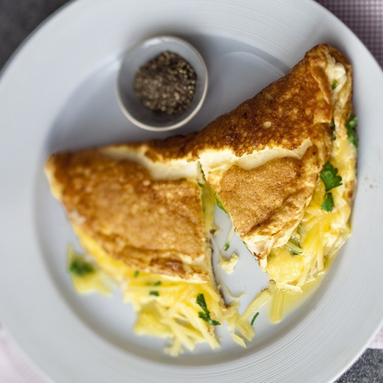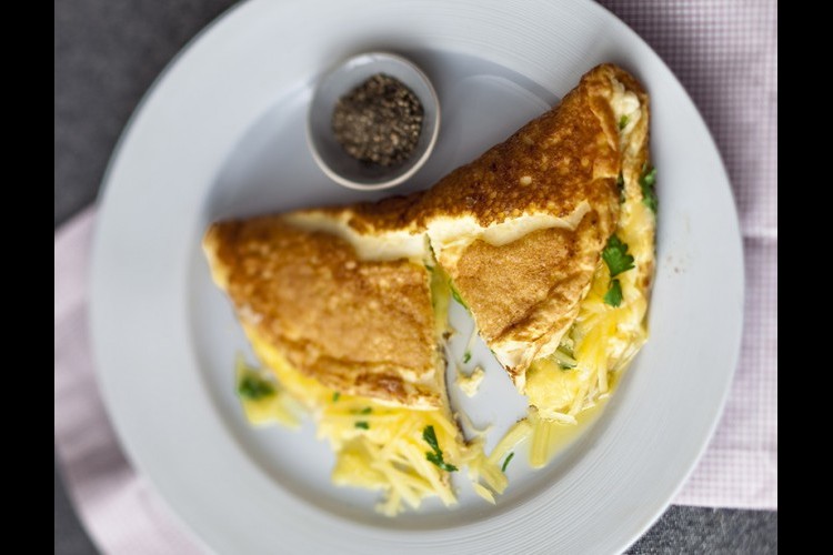 5. ينثر البقدونس والجبن على الـ”أومليت”، وحين ملاحظة ذوبان الجبن، تُلفّ الـ”أومليت” كما في الصورة، وتنقل إلى طبق التقديم، مع تجزيئها إلى جزئين بواسطة السكّين.