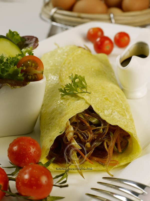 - يقدم الأومليت المحشو مصحوبا بالخس، الطماطم وصلصة الصويا.