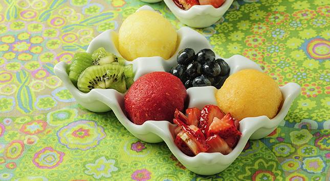 بمجرد أن تجهز الجرانيتا، يُغرف من كل نوع على طبق خاص بالبيض من البورسلين بالتبادل مع الفواكه الطازجة.