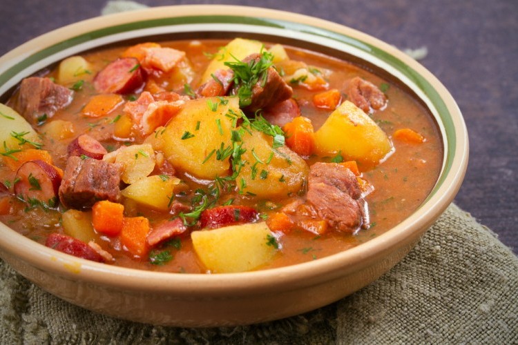 3. أضيفي الباذنجان، الجزر، البطاطس، الجزر، الكوسا والفلفل الرومي. اغمري المزيج بمرق اللحم.