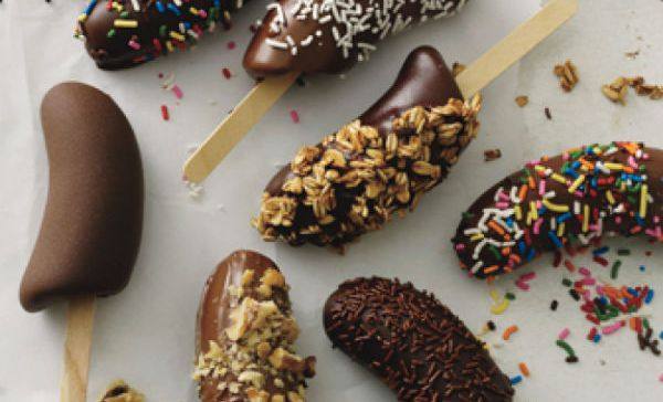 قطعي ثمرات الموز الى نصفين ثم تغرس في كل ثمرة واحدة من العصا ثم توضع في الفريزر.