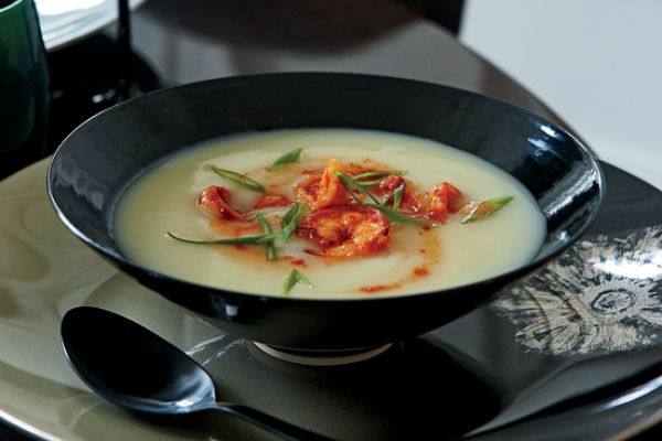 سخني الشوربة مرة اخرى مع ضبط الملح والفلفل الاسمر ووزعيها في اطباق التقديم مع الجمبري على الوجه.