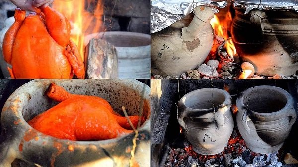 - في الجرة الثانية نضع الدجاج و نثبته فوق النار بالطريقة الموضحة في الفيديو.