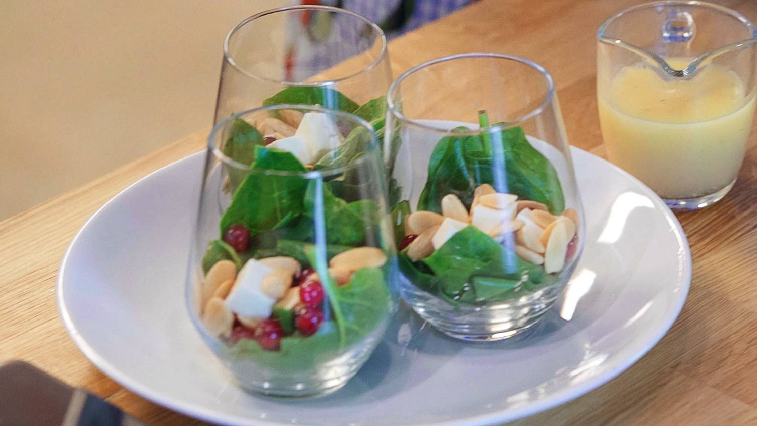 يرص فى اكواب السلطة ثم يضاف اليه طبقات من الجبن الماعز او الفيتا