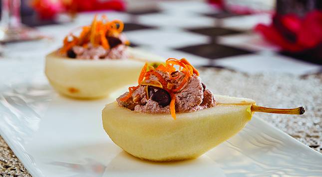 يغرف خليط جبن الريكوتا على الأجاص ويرش باللوز، ثم يزين ببشر البرتقال ويقدم.