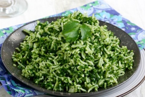 - في قدر متوسط الحجم سخني السمن، اضيفي البصل ، قلبي 4 – 5 دقائق الى ان يصبح ذهبي اللون. اضيفي الأرز الأخضر وقلبي جيدا.