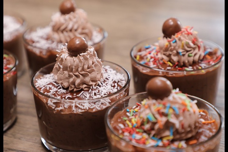 - وزعي رز بالحليب بأكواب التقديم، وزيني بالكريمة، وحبات الشوكولاتة، وفارمسيلي بحسب الرغبة.