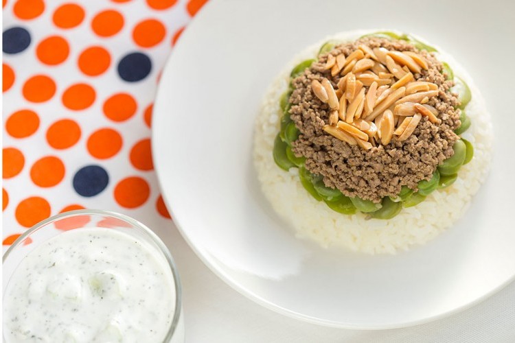 4. طريقة التقديم: يوضع الأرز في قعر طبق التقديم، وفوقه الفول المسلوق، فاللحم. ويُزيَّن الطبق بالمكسَّرات المحمَّصة (اختياري). ويُقدَّم اللبن المُضاف إليه فرم الخيار والملح، إلى جانبه.