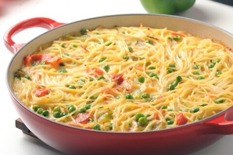- توضع السباجيتي في وعاء وتضاف البازلاء والفلفل والطماطم المجففة.